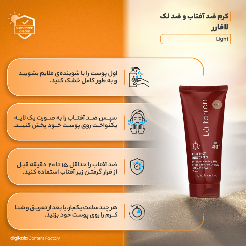 کرم ضدآفتاب و ضدلک رنگی لافارر مدل SPF40-Light، مناسب پوستهای خشک و معمولی، حجم 40 میلیلیتر