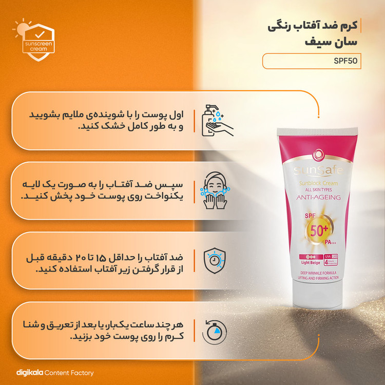 کرم ضدآفتاب و ضدچروک رنگی سانسیف با PA+++ و SPF 50، انتخابی بینظیر برای بانوانی است که به دنبال محافظت کامل از پوست خود در برابر اشعههای مضر آفتاب هستند و در عین حال به مراقبتهای ضد پیری و ضد چروک نیز اهمیت میدهند. این کرم با فرمولاسیون ویژه و ترکیبات غنی از عصارههای جلبک دریایی و بومادران، نه تنها پوست شما را از آسیبهای ناشی از اشعههای UVA و UVB محافظت میکند، بلکه به تغذیه و بازسازی پوست نیز کمک میکند. این کرم با ماندگاری 4 ساعته و ویژگی ضد چروک و ضد پیری، به طور موثری از ایجاد چین و چروکهای جدید جلوگیری کرده و به کاهش خطوط ریز و چروکهای موجود کمک میکند. با حجم 50 میلیلیتر، این محصول برای استفاده روزانه روی صورت طراحی شده و با بافت رنگی و تنالیته روشن، ظاهری طبیعی و یکدست به پوست میبخشد. با انتخاب کرم سانسیف، از تجربهای متفاوت و موثر در مراقبت از پوست خود بهرهمند شوید و از زیبایی و جوانی پوستتان لذت ببرید. همین حالا کرم ضدآفتاب و ضدچروک سانسیف را امتحان کنید و از محافظتی کامل و پوششی بینقص بهرهمند شوید.
