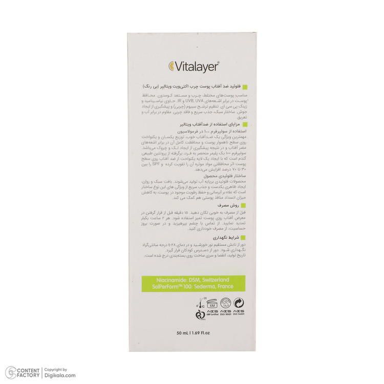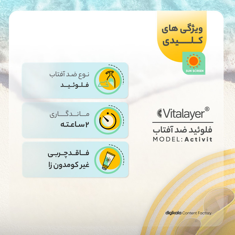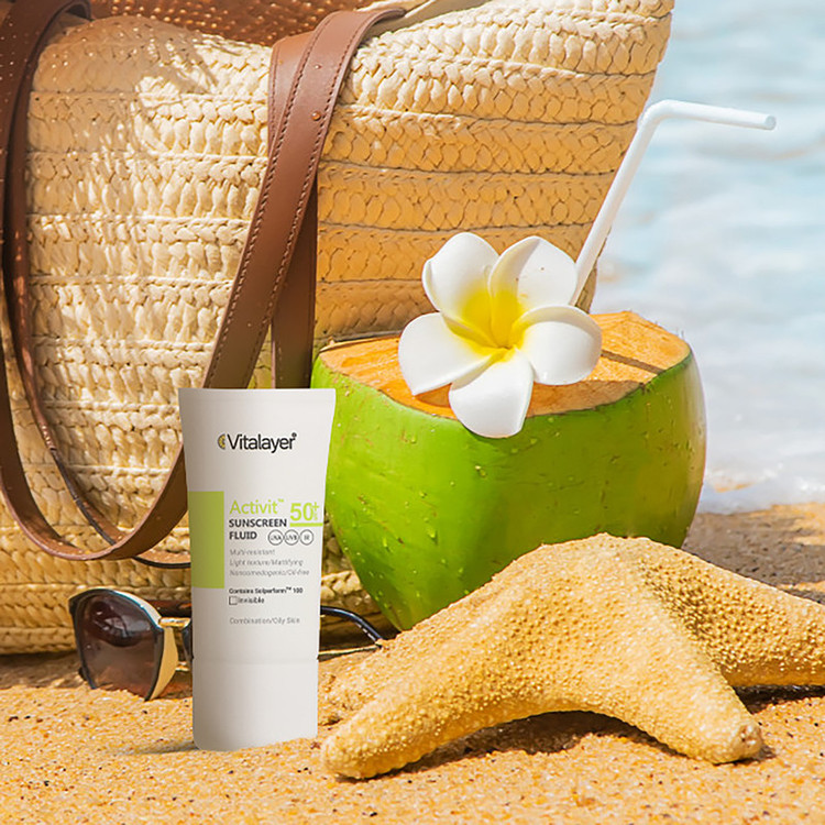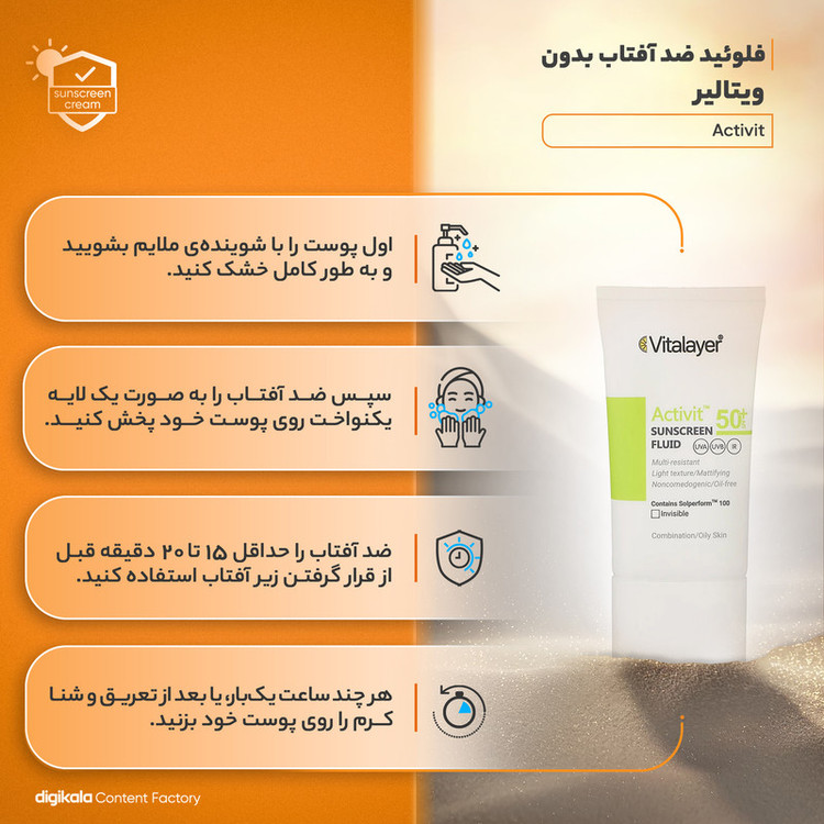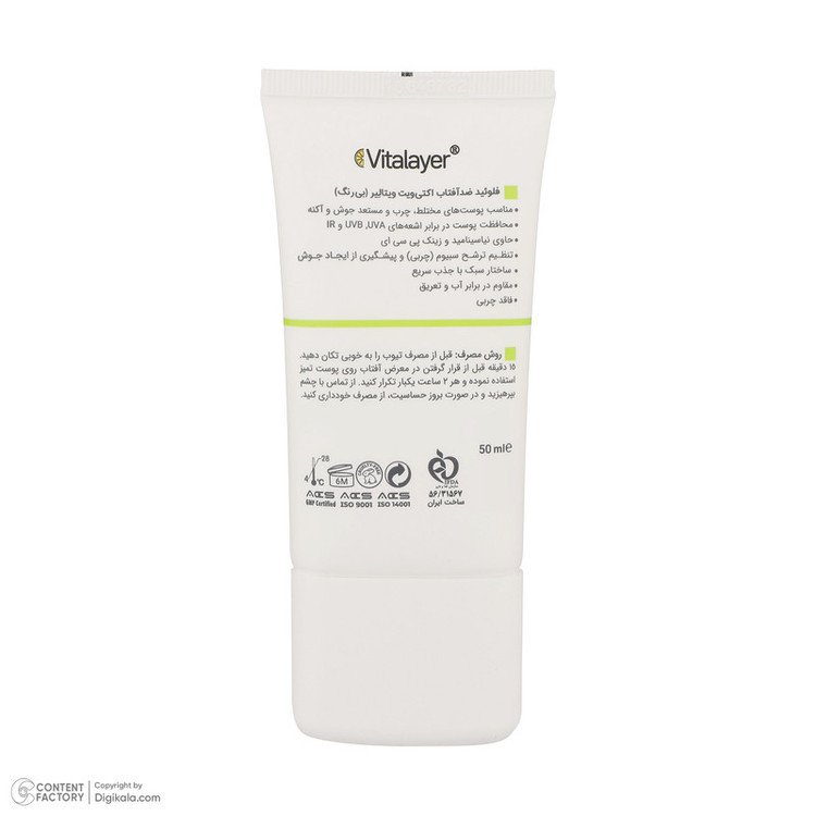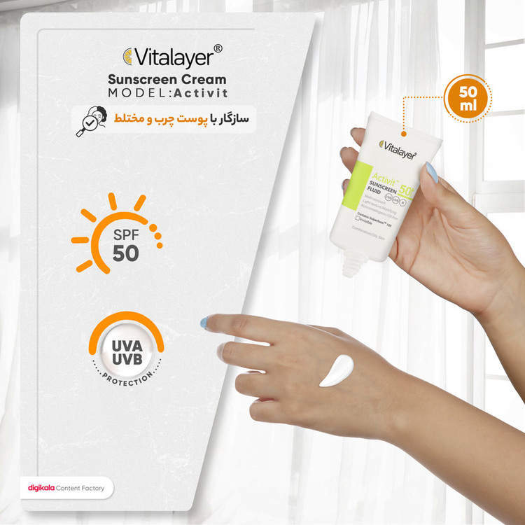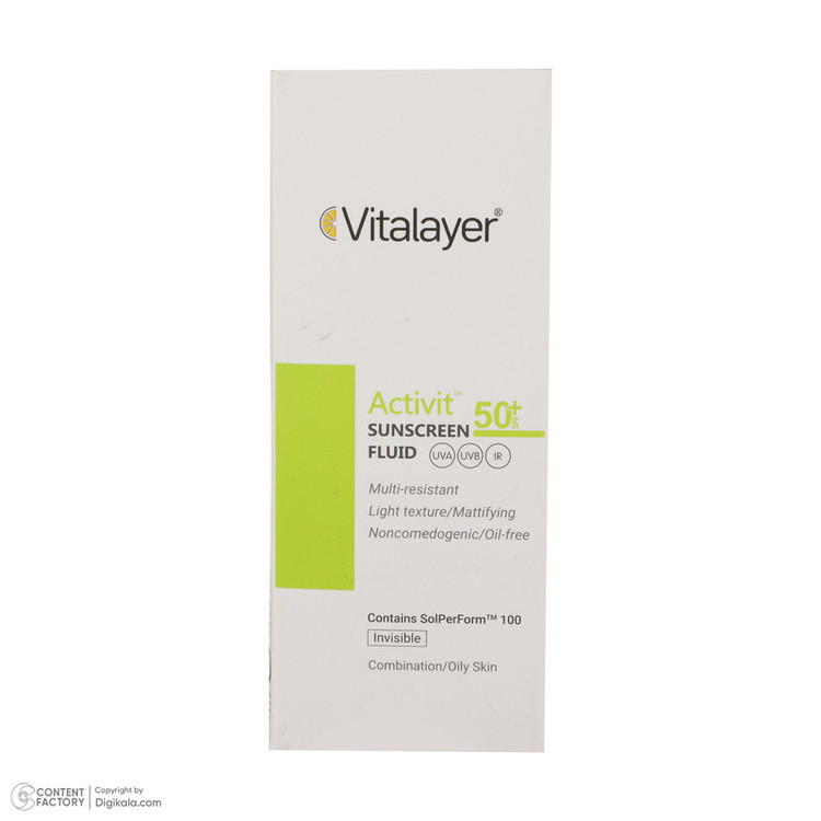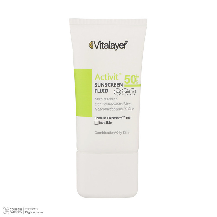فلوئید ضدآفتاب بی‌رنگ ویتالیر SPF50 مدل Activit، مناسب پوست‌های مختلط و چرب، حجم 50 میلی‌لیتر
