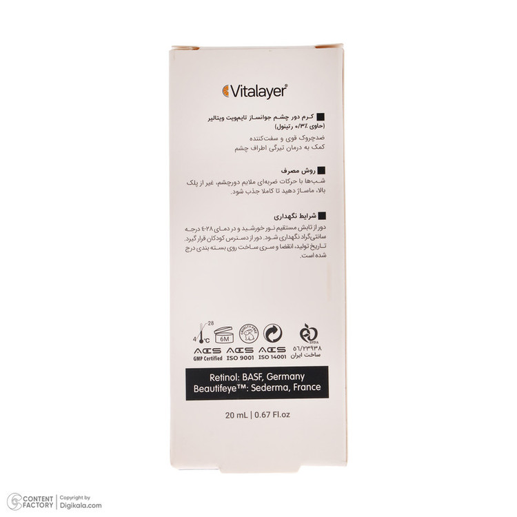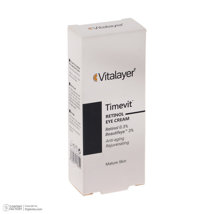 کرم دور چشم تایم ویت ویتالیر دارای ویتامین سی کپسوله است که قدرت بالایی در سنتز کلاژن دارد، این ترکیب موجب می شود خطوط پنجه کلاغی اطراف چشم رفع شده و علاوه بر آن با داشتن ترکیب رتینول که یک ضد چروک قوی و شناخته شده است باعث جوانسازی دور چشم می شوند. یکی دیگر از ترکیبات موثر آن Beautifeye است که خاصیت ضد افتادگی دارد. همچنین به کمک ریز مولکول های هیالورونیک اسید چروک های سطحی را پر کرده و باعث افزایش رطوبت ناحیه اطراف چشم می شود.با توجه به نازک و حساس بودن پوست اطراف چشم محصولاتی که برای این ناحیه استفاده می شوند باید فاقد پارابن و اسانس باشند.