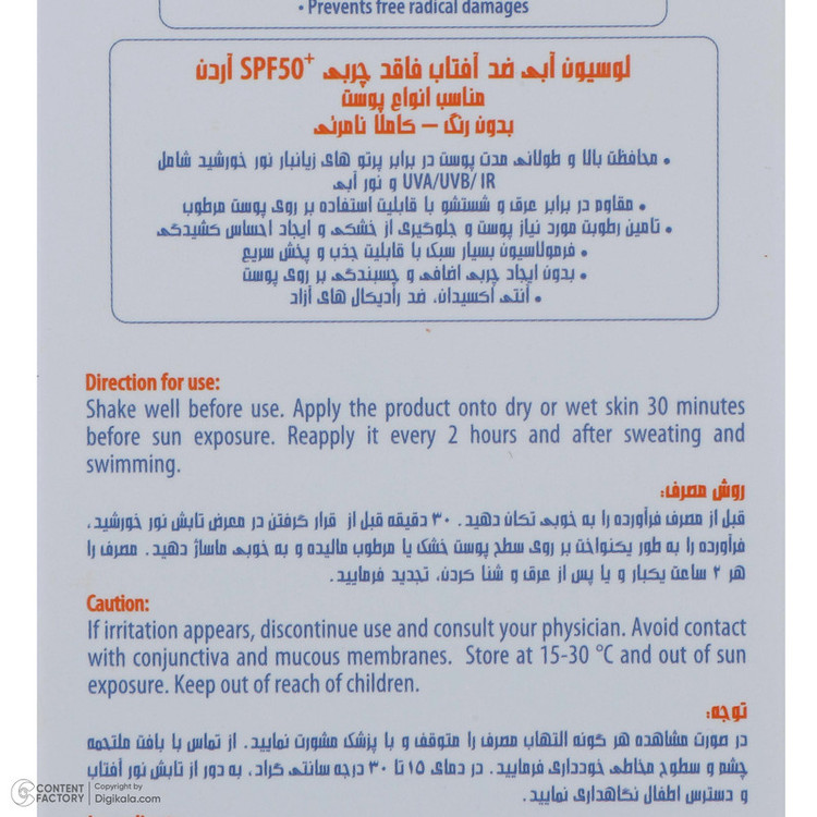 لوسیون ضدآفتاب آردن سولاریس با ویژگیهای سازگار با محیط زیست، انتخابی هوشمندانه برای کسانی است که به دنبال حفاظت کامل از پوست خود هستند، در حالی که به حیوانات و طبیعت احترام میگذارند. این محصول با فرمولاسیون بدون تست حیوانی، فاقد پارابن و سیلیکون، تعهد خود به پایداری محیط زیست را به نمایش میگذارد. با SPF 50، این لوسیون به طور موثری از پوست شما در برابر اشعههای مضر UVA و UVB محافظت میکند. با ماندگاری دو ساعته و ویژگی ضد آب، لوسیون آردن سولاریس انتخابی ایدهآل برای استفاده در شرایط مختلف آب و هوایی است. این محصول با حجم 100 میلیلیتر، مناسب برای استفاده روی صورت، گردن و بدن بوده و به دلیل بافت بدون رنگ و فاقد چربی، برای همه انواع پوست قابل استفاده است. لوسیون آردن سولاریس با ترکیباتی که فاقد مواد مضر هستند، به حفظ سلامتی و زیبایی پوست شما کمک میکند. با انتخاب لوسیون ضدآفتاب آردن سولاریس، نه تنها از پوست خود در برابر اشعههای مضر محافظت میکنید، بلکه به حفظ محیط زیست نیز کمک میکنید. همین حالا این لوسیون را امتحان کنید و از تجربهای مطمئن و سازگار با طبیعت لذت ببرید.