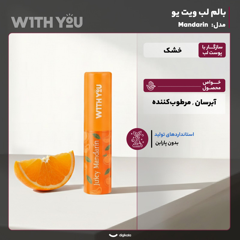 بالم لب نارنگی برند ویت یو محصولی ایدهآل برای مراقبت روزانه از لبها است که سلامت و نرمی لبها را تضمین کرده و تجربهای خوشایند و دلنشین ارائه میدهد. این بالم لب با بهرهگیری از عصاره طبیعی نارنگی و ترکیبات معدنی مفید، رطوبت عمیق و ماندگار به لبها میبخشد و از خشکی، ترکخوردگی و پوستهپوسته شدن آنها جلوگیری میکند. فرمولاسیون این محصول فاقد پارابن است و با پوست لب سازگاری بالایی دارد، بنابراین برای استفاده روزانه مناسب است. رایحه مطبوع و تازهی نارنگی حس طراوت و شادابی را هنگام استفاده منتقل میکند و تجربهای لذتبخش و انرژیبخش فراهم میسازد. بافت سبک و نرم بالم لب نارنگی ویت یو به آسانی روی لبها پخش شده و جلوهای طبیعی و جذاب ایجاد میکند. این محصول برای بانوانی که به سلامت، نرمی و زیبایی لبها اهمیت میدهند، انتخابی مطمئن و کاربردی محسوب شده و ترکیب اثربخش آبرسانی و رایحه خوش، مراقبت لبها را به تجربهای لذتبخش تبدیل میکند.