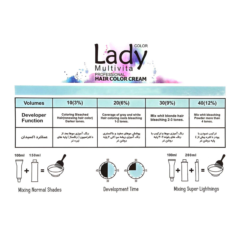 رنگ مو لیدی کالر شماره 6.34 حجم 100 میلی لیتر رنگ بلوند تنباکویی تیره با قابلیت پوششدهی کامل این امکان را دارد که موها را به صورت دلخواه تیرهتر و روشنتر کند. قدرت پوششدهی رنگ موی لیدی کالر برای موهای خاکستری بسیار بالا و عملکرد آن در هر شرایطی کاملا پایدار است. رنگ مو لیدی کالر شماره 6.34 حجم 100 میلی لیتر رنگ بلوند تنباکویی تیره حاوی عصارۀ کراتین، ویتامین C، نرمکننده و حالتدهنده است که باعث درخشندگی ساقۀ مو میشود و از شکنندگی و خشکی آن جلوگیری میکند. برای مصرف رنگ موی لیدی کالر، 100 میلیلیتر از آن را در یک ظرف غیرفلزی بریزید و برای رنگهای معمولی به مقدار 150 میلیلیتر اکسیدان به آن اضافه کنید. توصیه میشود برای کسب نتیجۀ بهتر، رنگ موی لیدی کالر را فقط روی موی خشک استفاده کنید.